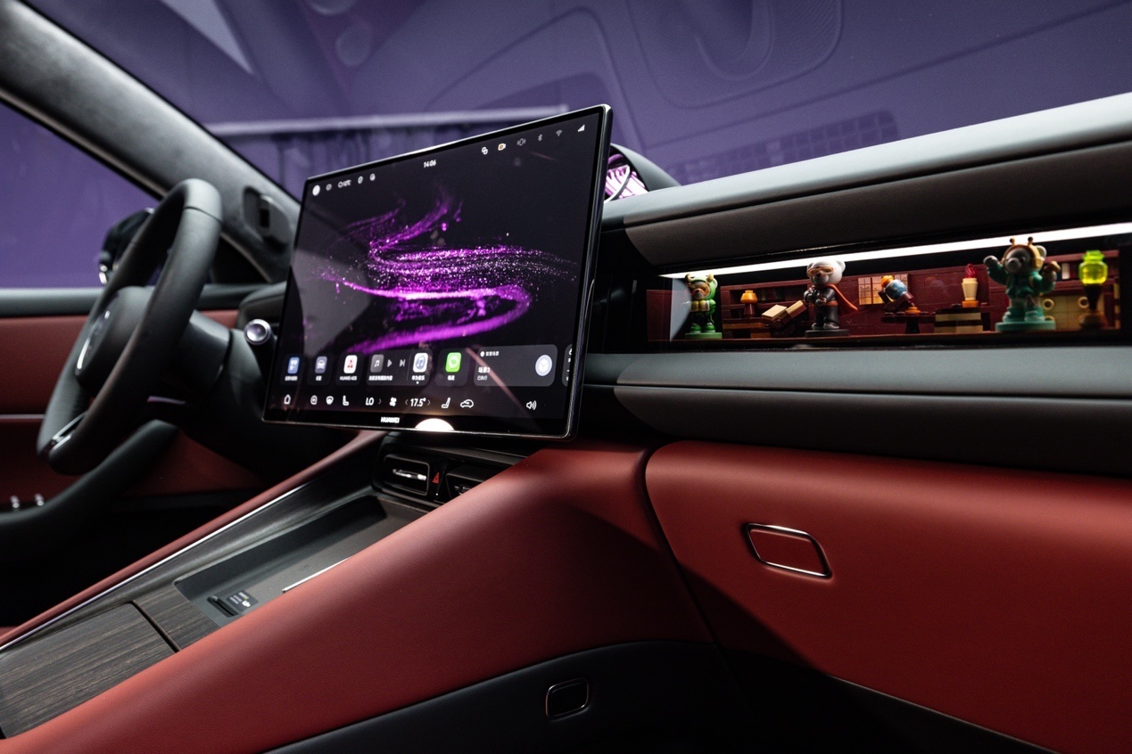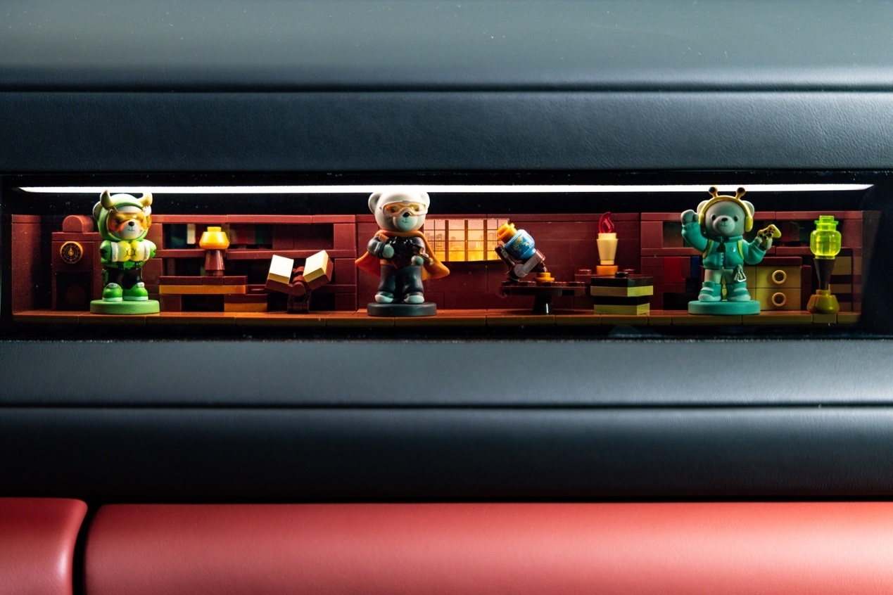 副驾这边有个叫“灵感橱窗”的设计。说白了就是副驾前方区域被设计成了一个可自定义的展示空间,可以放手办、通过墨彩相册设置动态屏保。工程师特意强调这是基于安全前提设计的,气囊弹出逻辑和传统副驾区域做了区分,不影响弹出。这个点挺有意思——它把传统汽车内饰里最无聊的那块区域,变成了一个可以玩的地方。