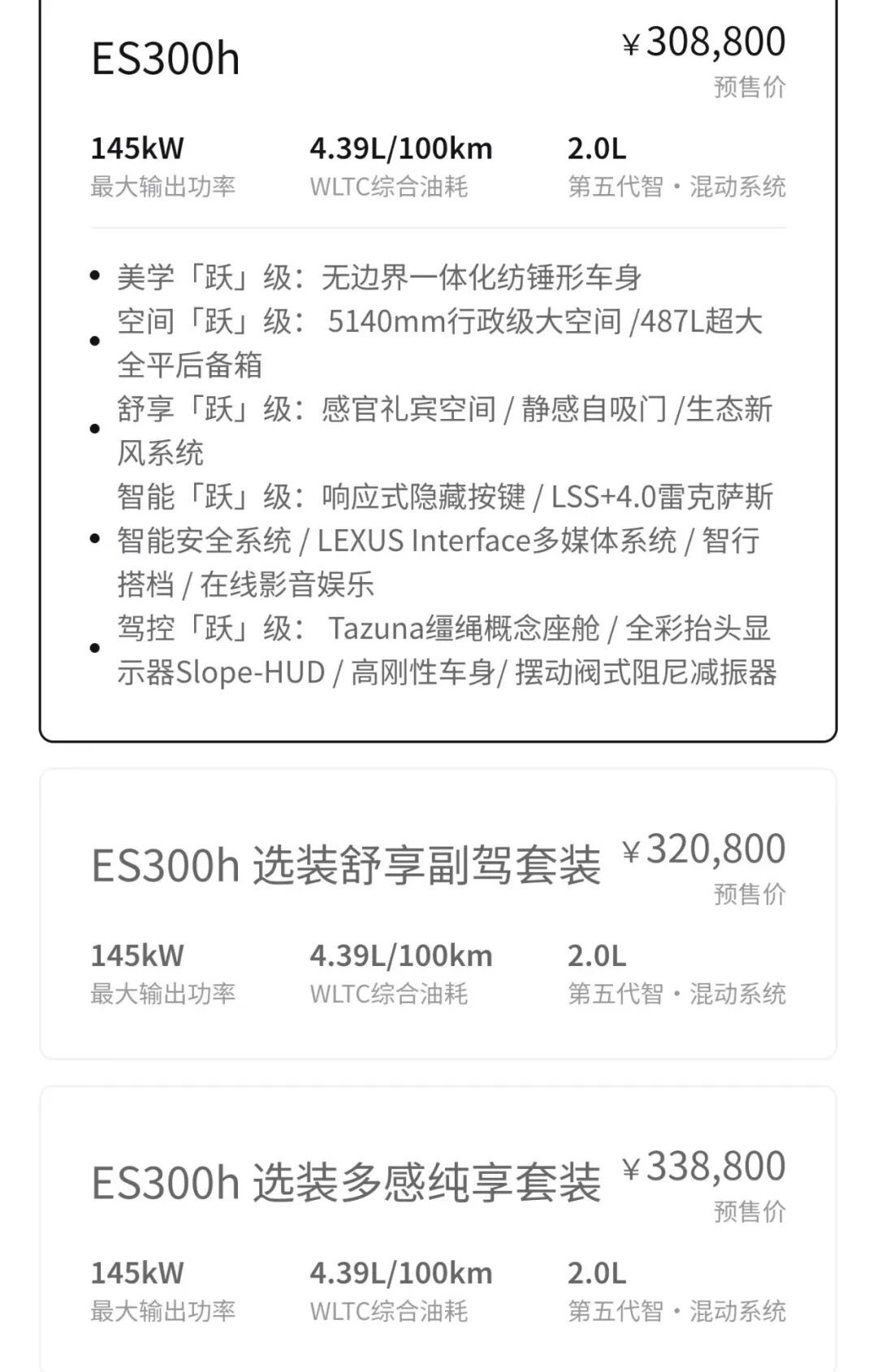 3月20日,雷克萨斯旗下核心中大型豪华轿车全新一代ES正式开启预售,新车先期推出3款ES300h混动车型(其实是一款车型,然后再加2个选装包),预售价区间为30.88万-33.88万元,后续还将补充纯电动版ES350e车型。